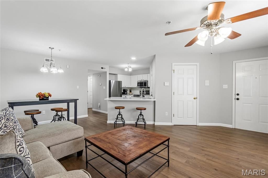 Discover the perfect blend of modern style and effortless living in this beautifully updated condo within the highly sought-after Forest Springs community. As you step inside, you are greeted by a sprawling open floor plan showcased by brand-new luxury vinyl plank flooring and a bright bay window that floods the space with natural light. The chef-inspired kitchen is a true standout, featuring new quartz countertops, a sleek subway tile backsplash, a new stainless steel refrigerator, and a redesigned peninsula with an upgraded extension for barstool seating-a unique architectural feature not found in standard units within the complex. Both full bathrooms have been refined with newer comfort-height toilets, modern lighting, and updated fixtures, while the primary suite offers a private retreat complete with a walk-in closet and a custom built-in cabinet. The unit has been freshly painted throughout and enhanced with recessed lighting, complemented by the convenience of an enclosed laundry closet with a washer and dryer and a private deck off the guest bedroom. Beyond the interior, this home provides a one-car garage, additional parking, and an oversized private storage room in the lower level. Located within the award-winning Parkway School District, this move-in-ready home includes an association fee that covers pool access, water, sewer, and trash, offering an unparalleled lifestyle of comfort and convenience. Quick access to Highway 141, I-44, and Big Bend, and just minutes from shopping, dining, parks, and nearby areas like Valley Park and Fenton.